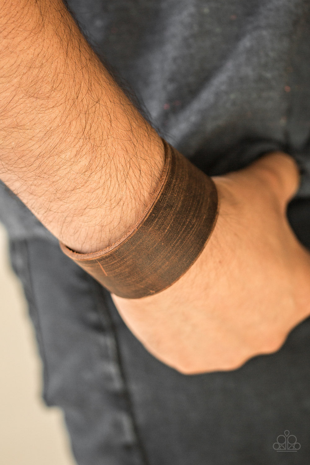 A distressed brown leather band wraps around the wrist for a rugged look. Features an adjustable snap closure.