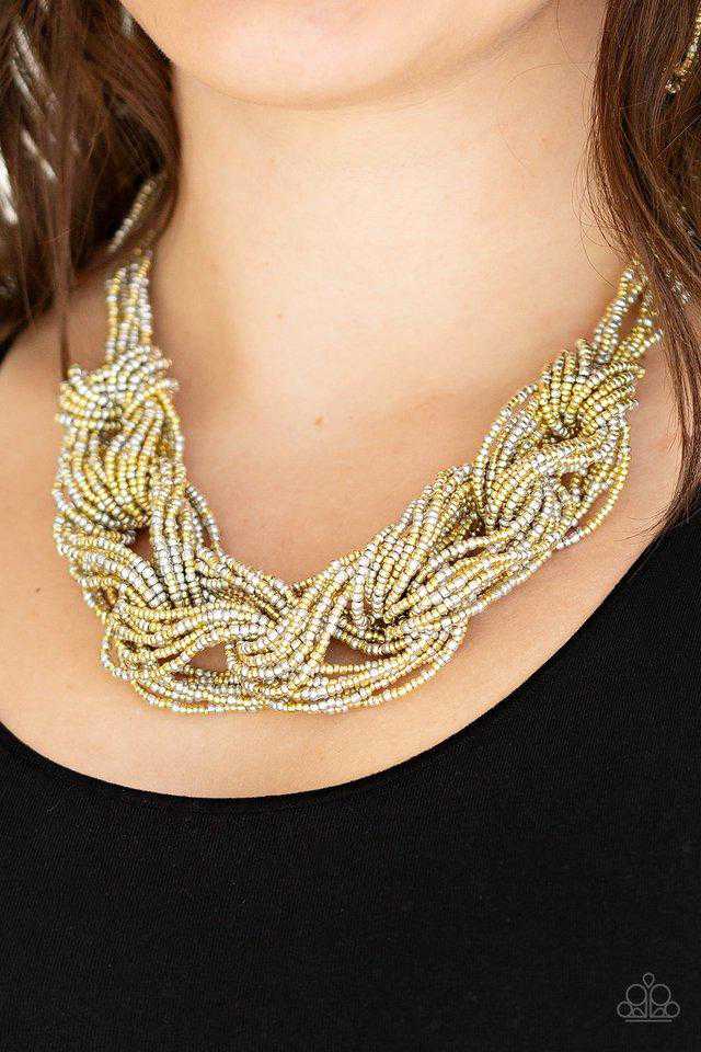 Brushed in a flashy finish, countless strands of gold and silver seed beads weave into a bulky square braid below the collar for a glamorous look. Features an adjustable clasp closure. Sold as one individual necklace. Includes one pair of matching earrings.