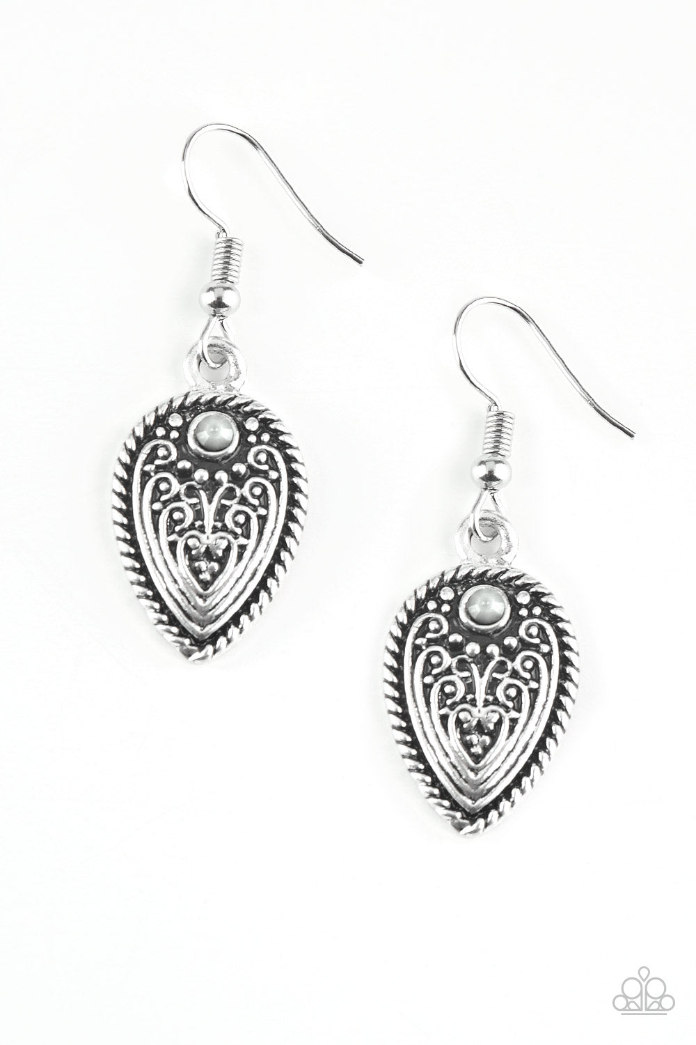 Embossed in whimsical antiqued textures, a shimmery silver teardrop frame swings from the ear. A dainty gray bead is pressed into the top of the frame for a colorful finish. Earring attaches to a standard fishhook fitting.