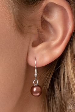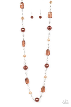 Bubbly tan and brown pearls join brown crystal-like gems along a silver chain, resulting in a prismatic pop of color across the chest. Features an adjustable clasp closure.