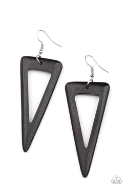 Painted in a shiny black finish, a sharp triangular wooden frame swings from the ear for a fiercely earthy look. Earring attaches to a standard fishhook fitting.