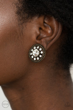 Featuring an oversized center, a white rhinestone encrusted flower blooms across the brass center of a studded frame for a sparkly finish. Earring attaches to a standard clip-on fitting.
