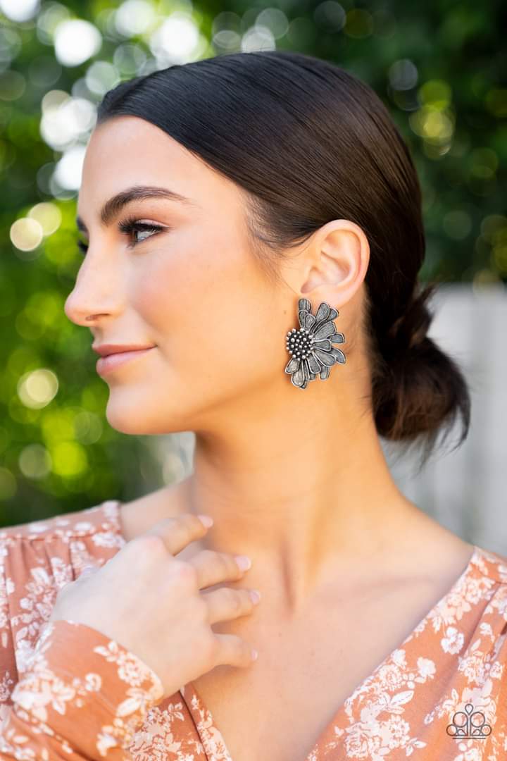 Imperfect silver petals bloom from a studded center, layering into a rustic half blossom for a whimsical flair. Earring attaches to a standard post fitting.